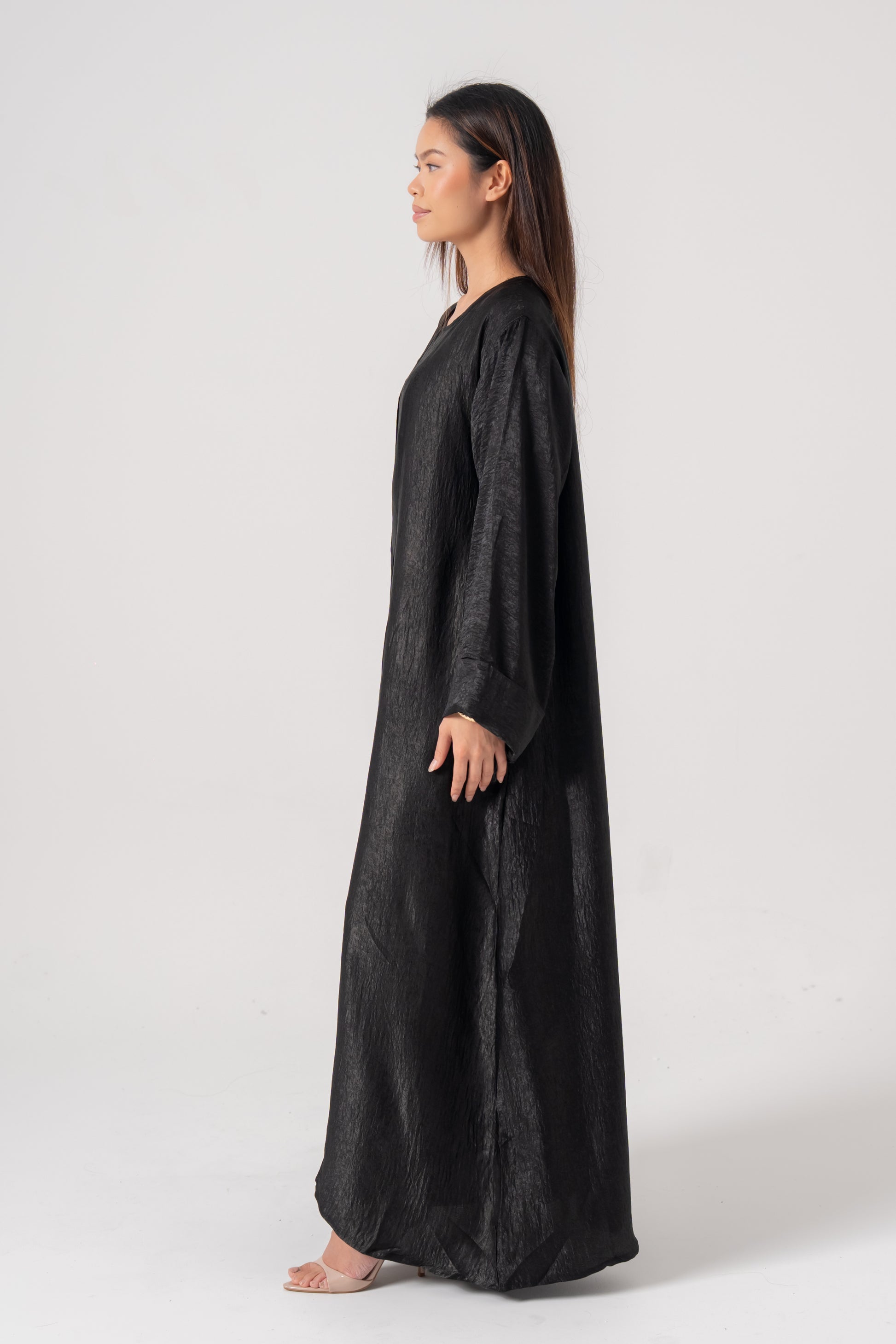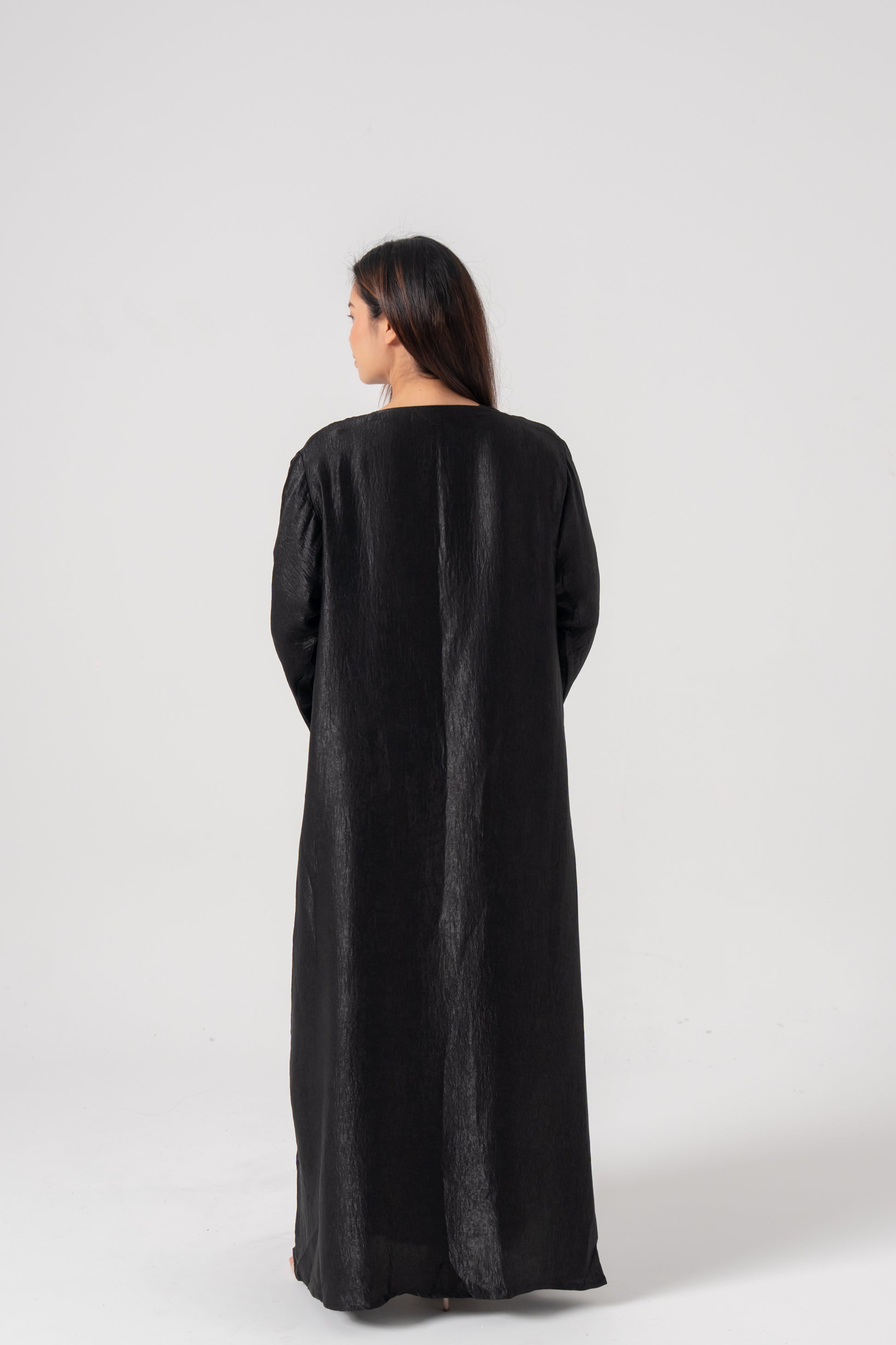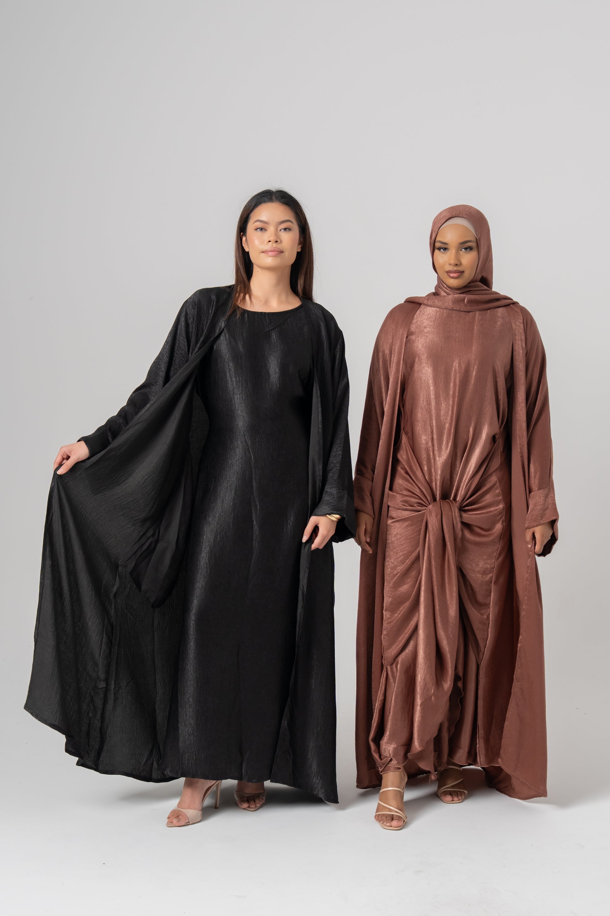 The Aÿra 3-piece satin abaya offers a luxurious and elegant look with its smooth, satin fabric that boasts a beautiful sheen. Lightweight and comfortable, it features a closed inner dress with a stylish tie design for a flattering fit. The outer abaya layers perfectly over the inner dress, creating a sophisticated, flowing silhouette. This set also includes a matching scarf to complete the ensemble.