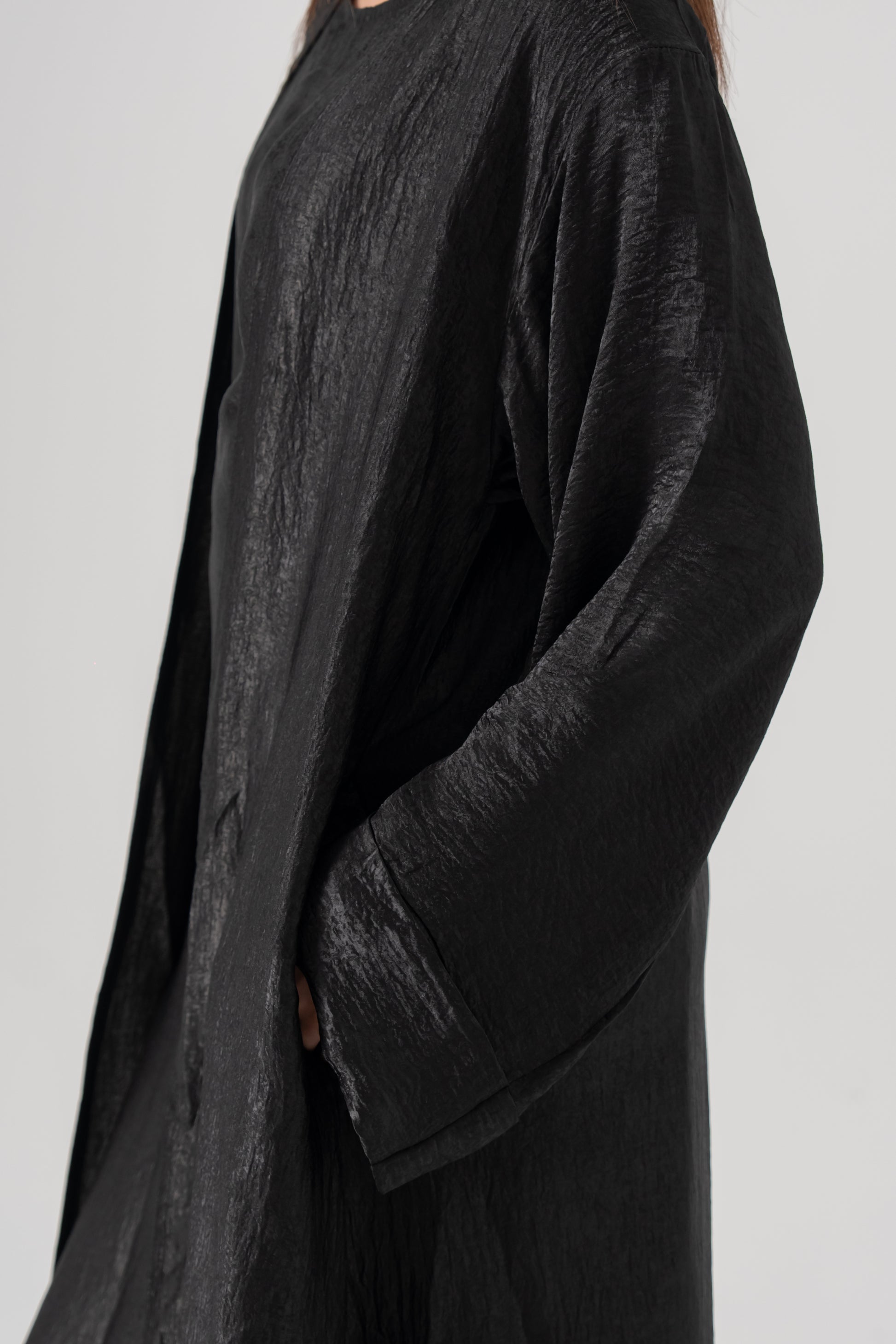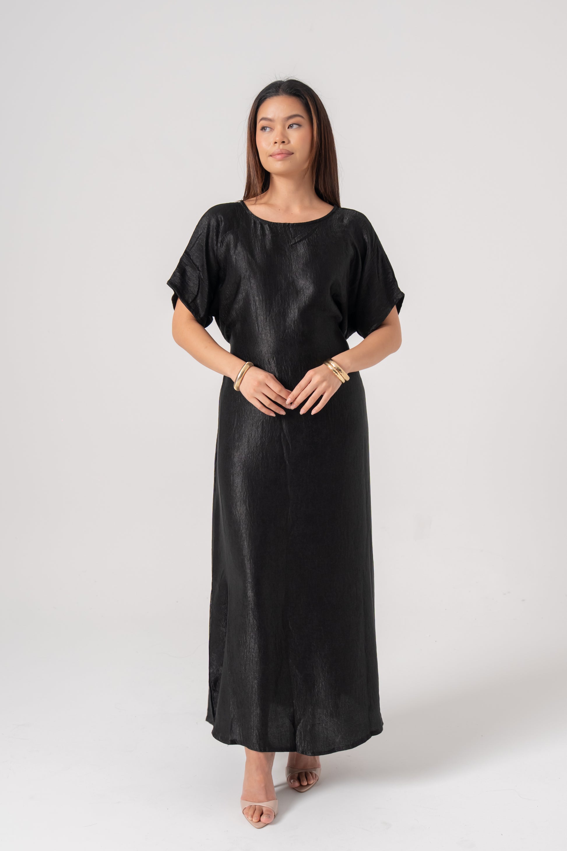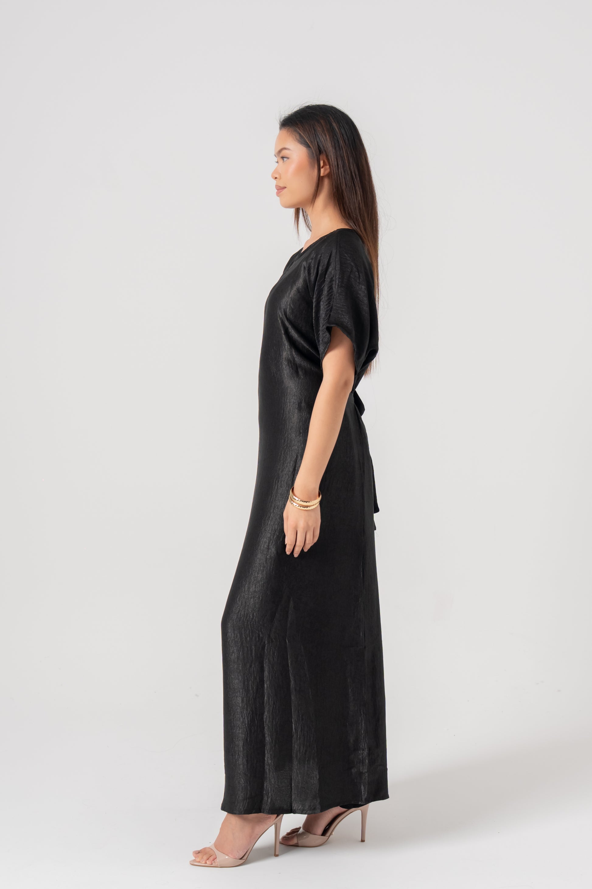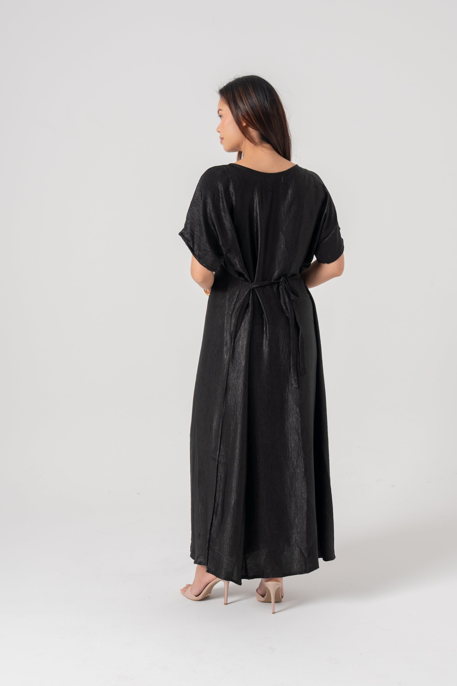 The Aÿra 3-piece satin abaya offers a luxurious and elegant look with its smooth, satin fabric that boasts a beautiful sheen. Lightweight and comfortable, it features a closed inner dress with a stylish tie design for a flattering fit. The outer abaya layers perfectly over the inner dress, creating a sophisticated, flowing silhouette. This set also includes a matching scarf to complete the ensemble.