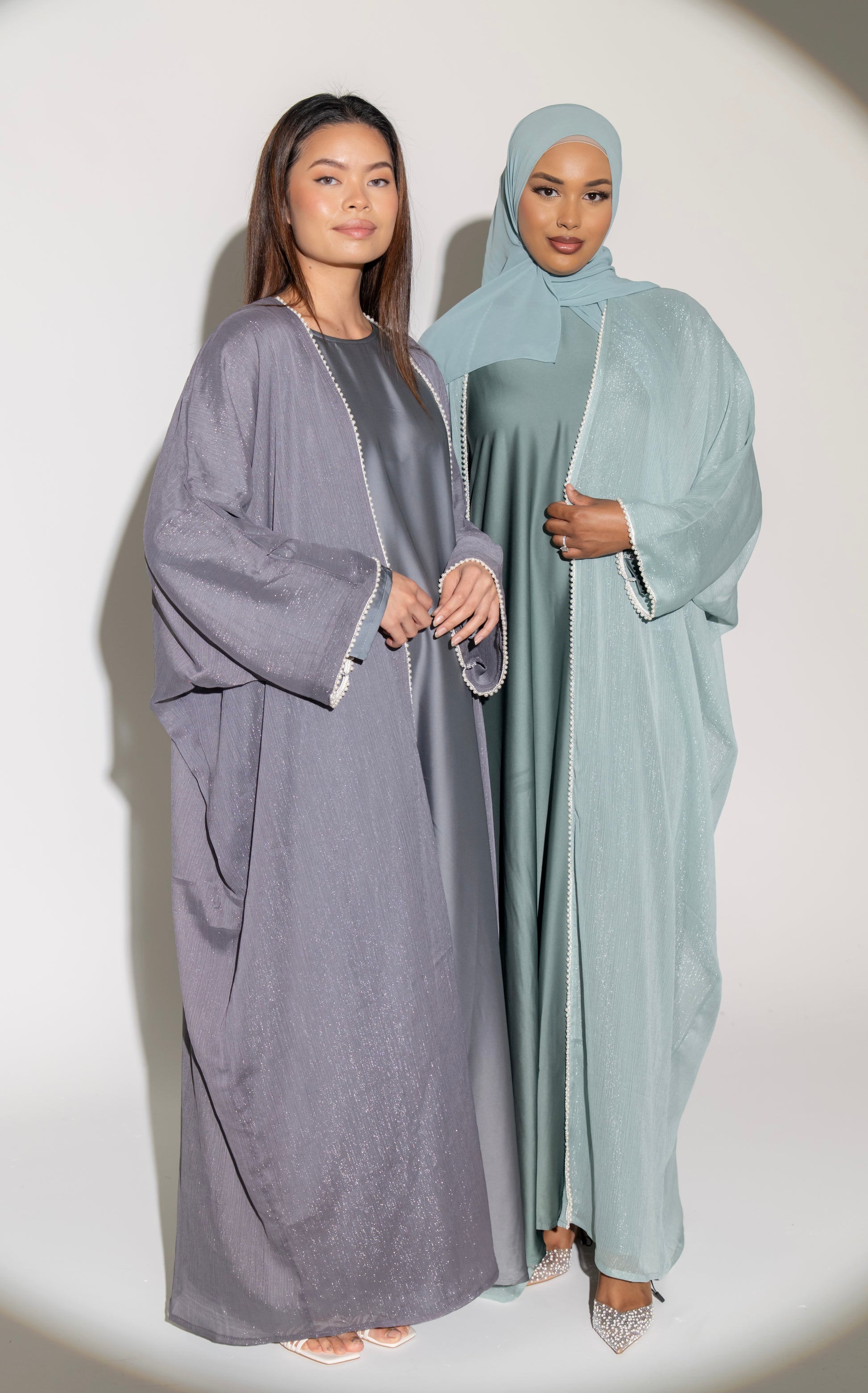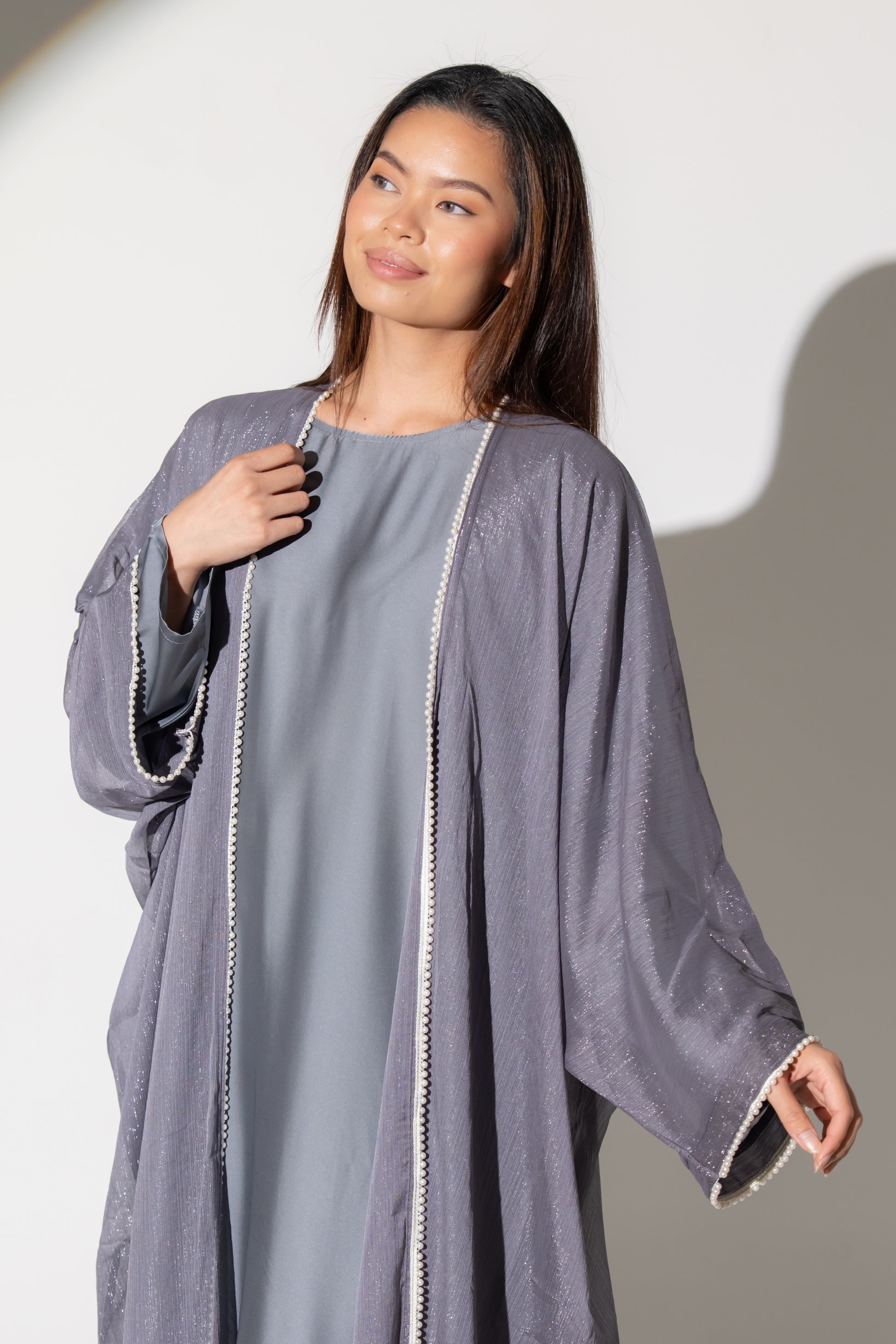 - Lightweight Outer Abaya – Designed with a gentle shimmer woven into the fabric, this outer layer is beautifully adorned with delicate pearl detailing along the front and sleeves, adding a graceful sparkle to your every movement.